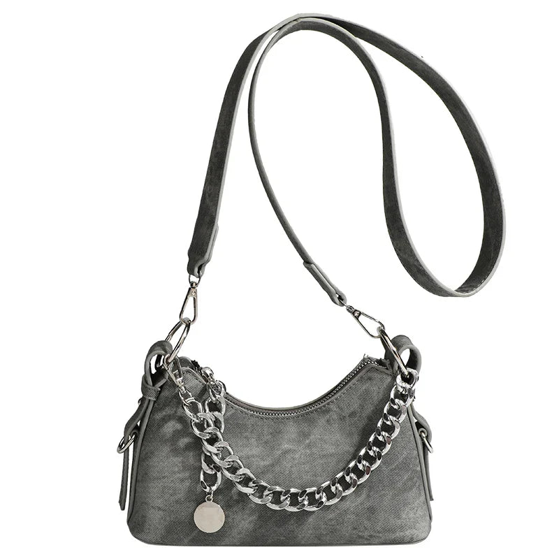 Crafted from durable washed denim with a soft, broken-in feel, this shoulder bag pairs its polished chain detail with a lightweight, easy-to-wear design. The compact yet functional interior keeps your essentials organized, making it an everyday staple that adds style without the effort.