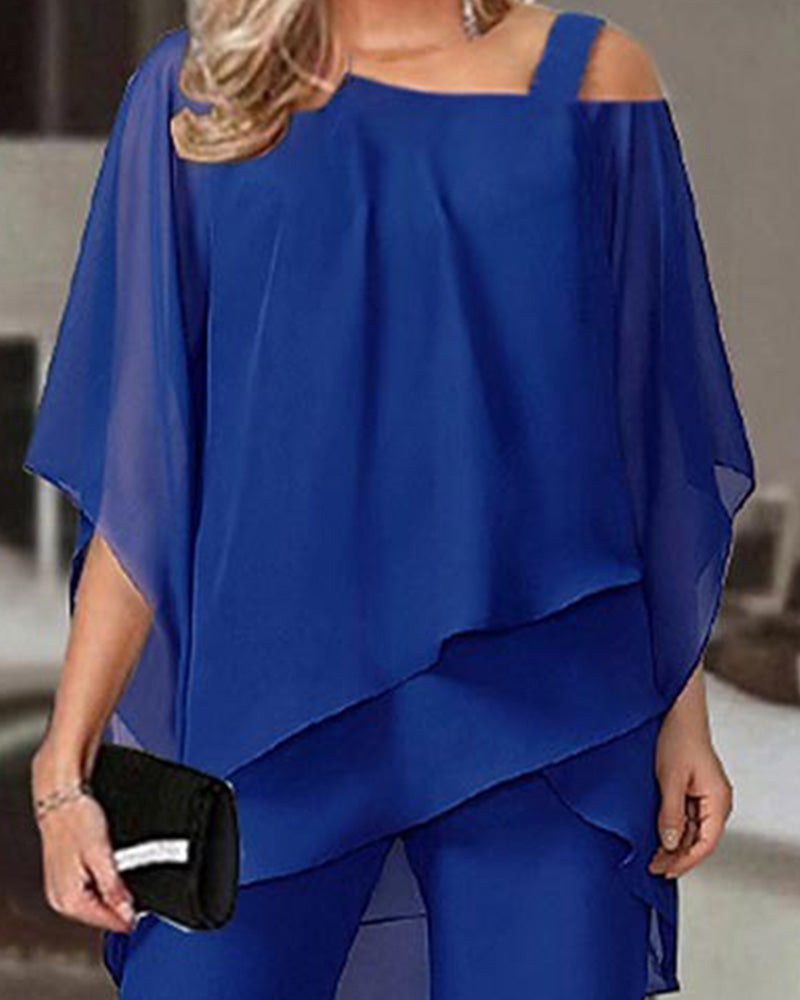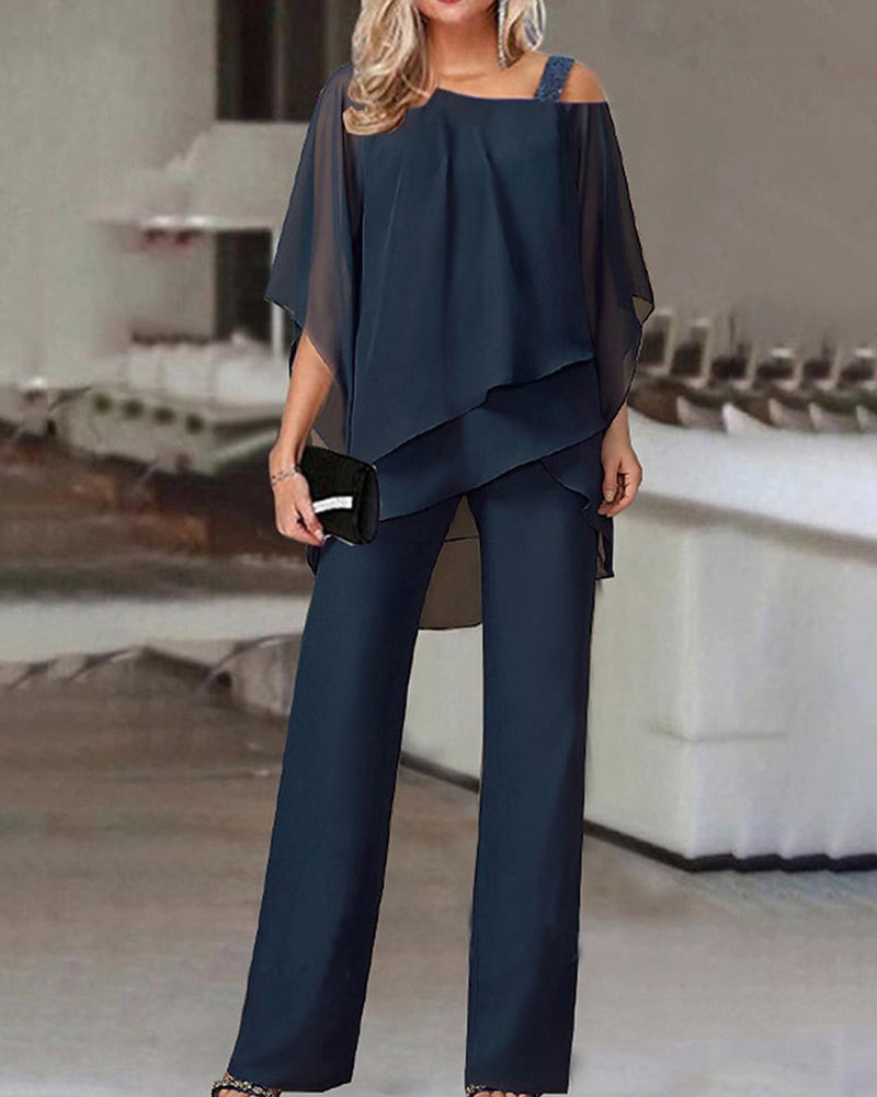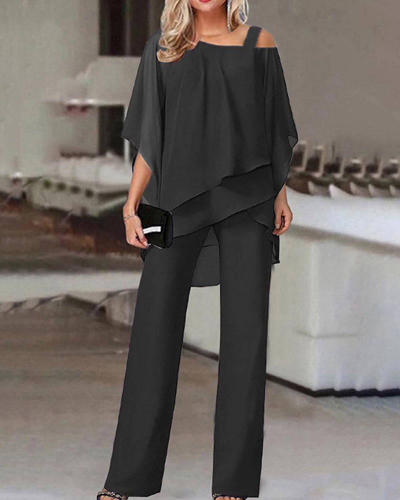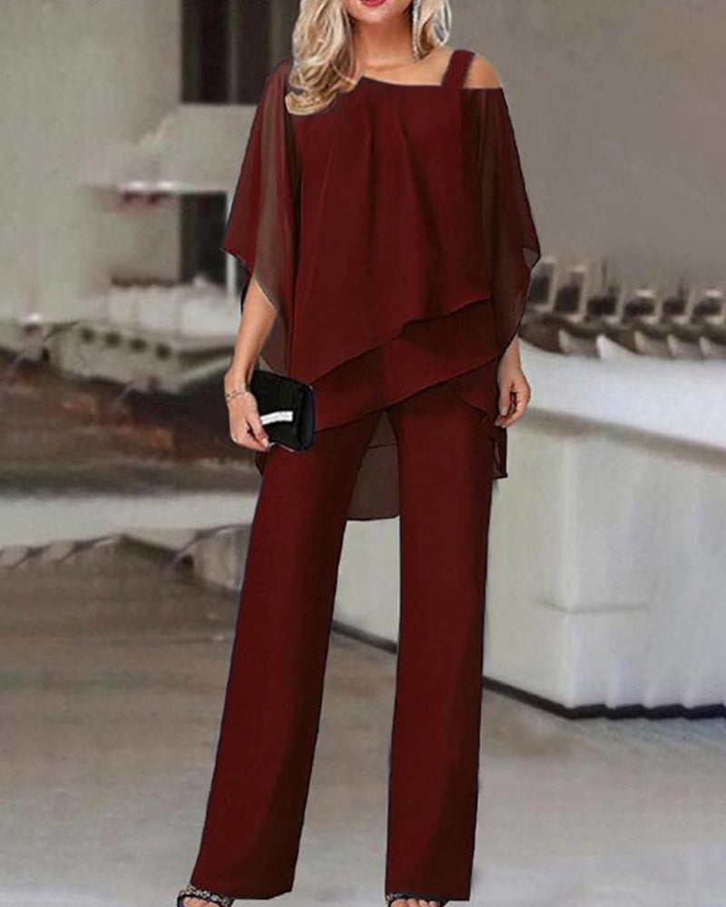 • Design: One-shoulder neckline, flowing double-layer chiffon cape sleeves, wide-Leg silhouette