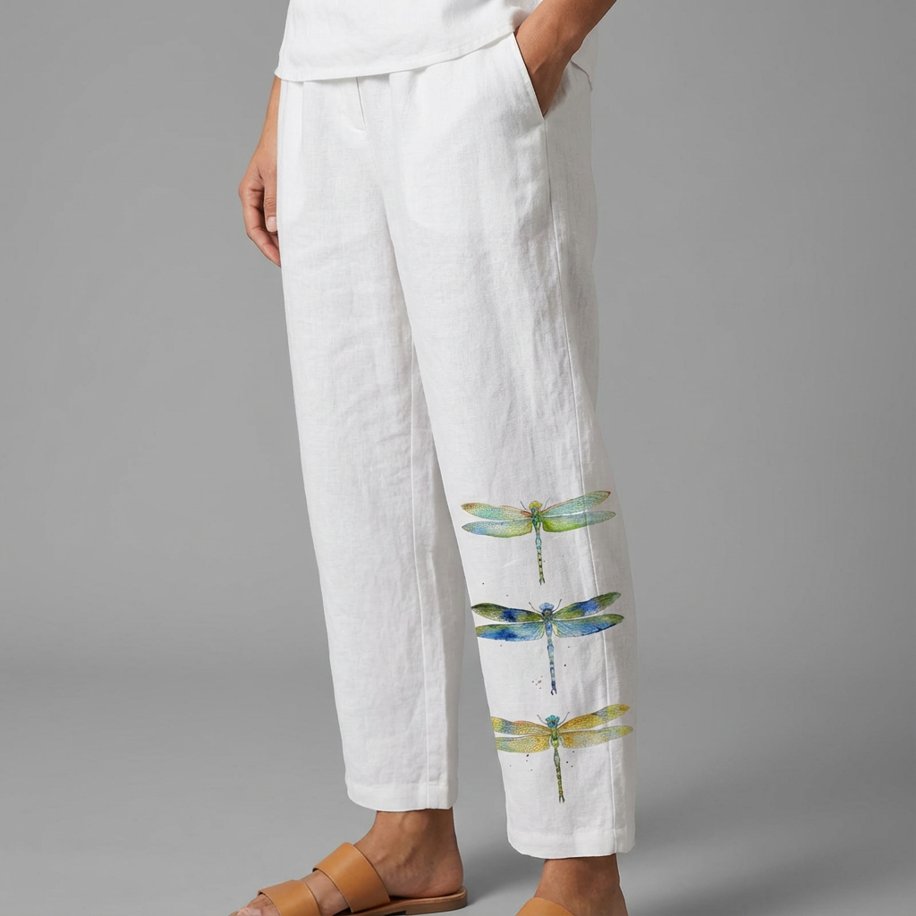 Step into comfort and elegance with the Meryl Dragonfly Print Pants. Designed for those who appreciate both style and ease, these lightweight pants feature a delicate dragonfly print that adds a whimsical charm to your everyday look. Perfect for casual outings or a relaxed workday, they offer a flattering loose fit and a breathable fabric blend fabric to keep you comfortable all day long.